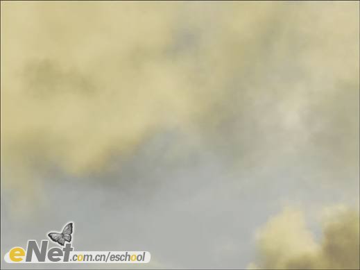 第十步:點(diǎn)擊圖層調(diào)板下方的【創(chuàng)建新組】按鈕,創(chuàng)建一個(gè)新組,將其命名為【云】,將3個(gè)“云”圖層拖入組【云】中。選擇組【云】,然后點(diǎn)擊【添加矢量蒙版】按鈕,為組【云】添加蒙版。然后選擇黑色的柔性筆刷,在蒙版上涂抹,得到下圖所示效果。