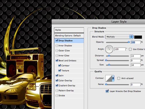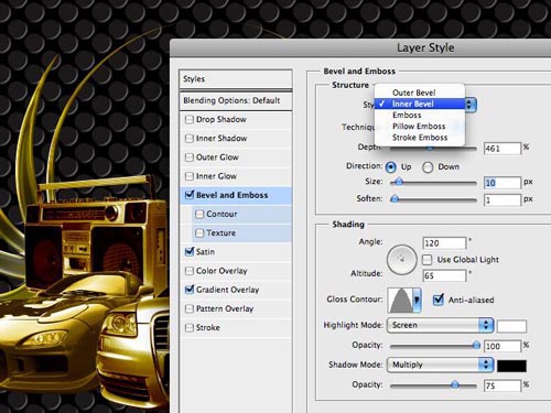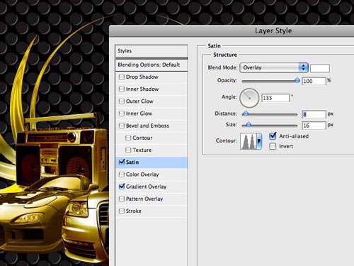 然后再打開這層的混合選項,選擇“光澤”,接下來您需要試驗不同的設置來達到你想要的效果。這里你可以看到有一些深入的變化,我把模式選為疊加,等高線選為雙高峰。具體設置如下圖: