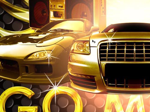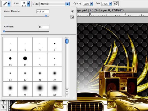 然后復制這一層,放到所有層的上面。適當調整不透明度,降低一點。用橡皮擦清除位于中間汽車和其邊緣的部分,這樣你會看到光的蔓延,就像下圖那樣。