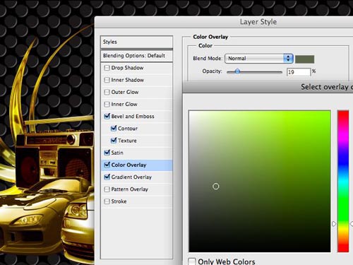 現在我覺得“翅膀”有些偏橙色,我可以回去調整“漸變疊加”,不過那樣滿痛苦的,每一個可能影響到的點都要改,相比之下不如添加一個“顏色疊加”,我選擇了深色不飽和的綠,以減低紅色對圖像的影響。通過對不透明度的調整,我覺得現在的色彩要比先前好點。