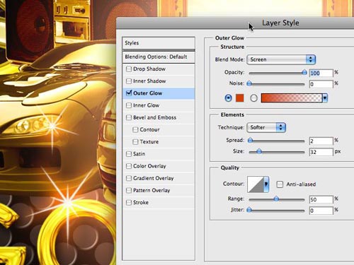 好了,現在用新筆刷添加一些閃光。然而,是不是覺得這些閃光可以更好點,對它使用新的層樣式,為什么不了。