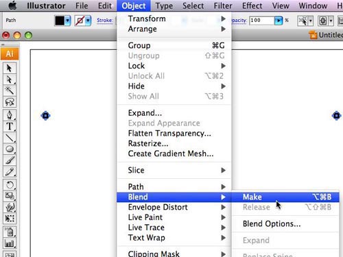 全選你的圓,使用“對象-混和-擴展”,讓他們一體化。接著復制它,讓它們之間有段距離并保持垂直。然后重復第六步的步驟,添加圓,并給指定步數一個恰當的值。(這里盡量讓圓之間的距離一樣)
