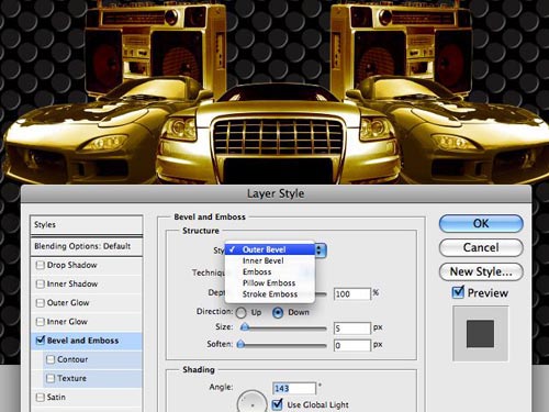 添加一個黑色背景,然后給網格層添加混合模式,選中“斜面與浮雕”,樣式設為外斜面。方向為下,其他設置如圖。(這里可以把圓的色彩調成灰黑色,再拷貝到photoshop里)