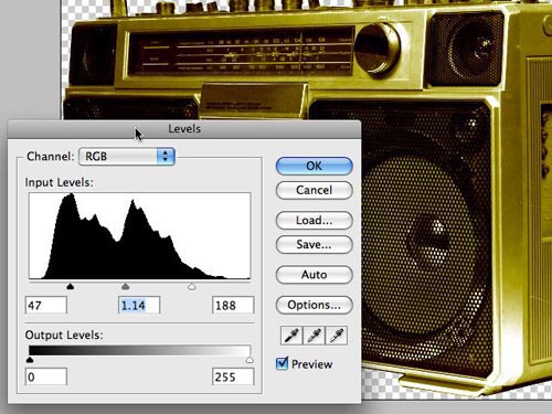 然后調整“色階”(ctrl+l),數值如下圖。看看如何,怎么樣,不到2分鐘打造了一個金色播放機,效果還不錯吧。