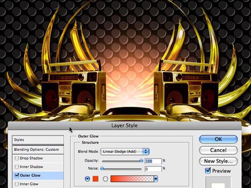 對這層使用“外發光”,模式選為“線性減淡”,不透明度100%,顏色為橙紅色。