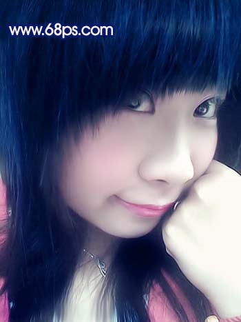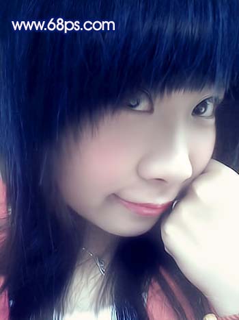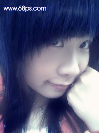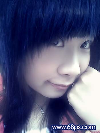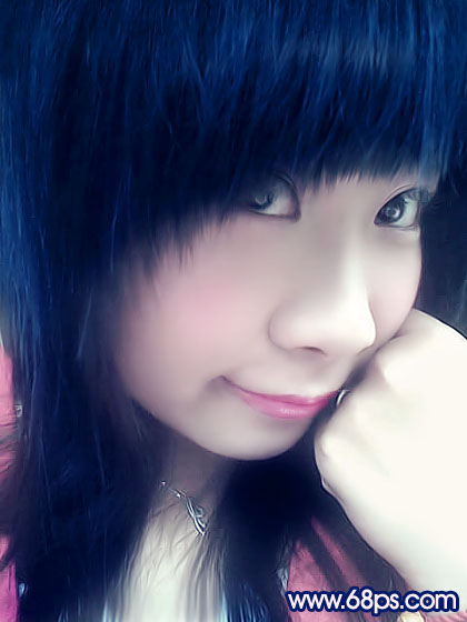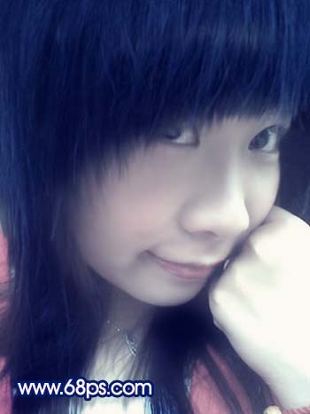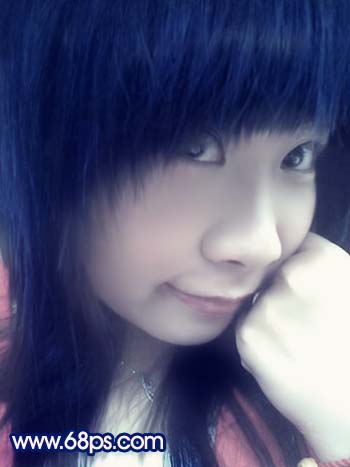 4、新建一個圖層,把前景顏色設置為:#010732,然后用畫筆工具把頭發部分涂黑,如圖5,然后把圖層混合模式改為“柔光”,效果如圖6。
