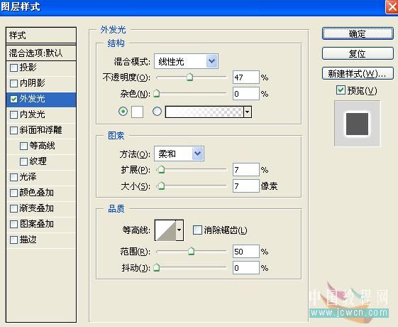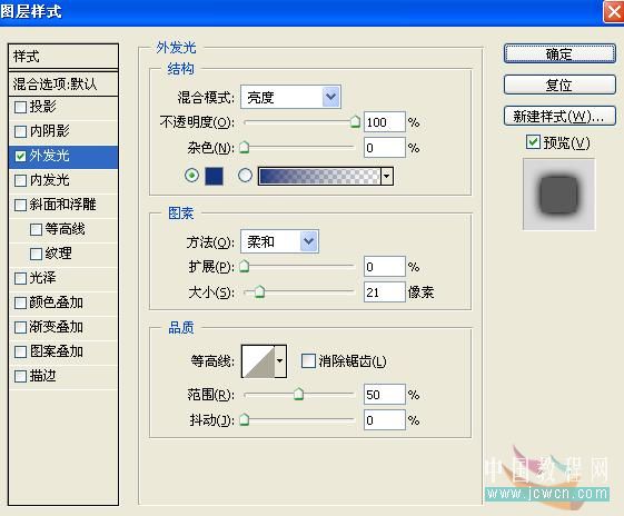 十、雙擊圖層1副本調(diào)出圖層樣式,勾選外發(fā)光,混合模式為:亮度、不透明度100、設置顏色為#12347e、大小21,其它不動