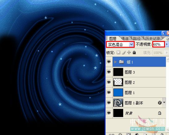 二十二、按ctrl+g將所有的星星編組,得到組1,設置星星圖層混合模式為實色混合,調(diào)整圖層透明度為60%
