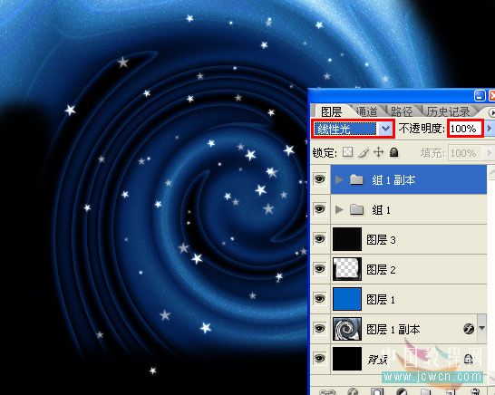二十四、設置組1副本混合模式為線性光,圖層透明度為100%