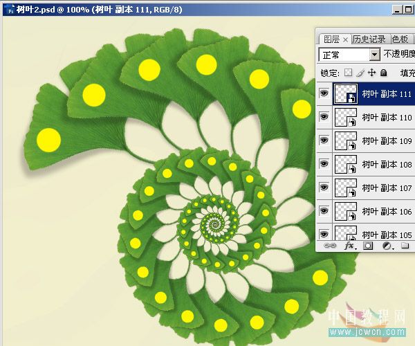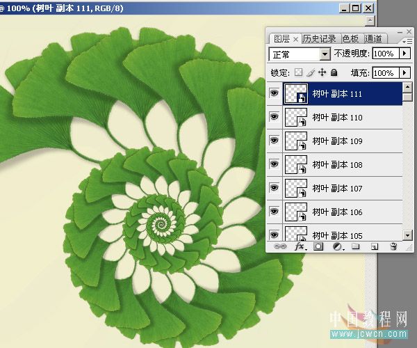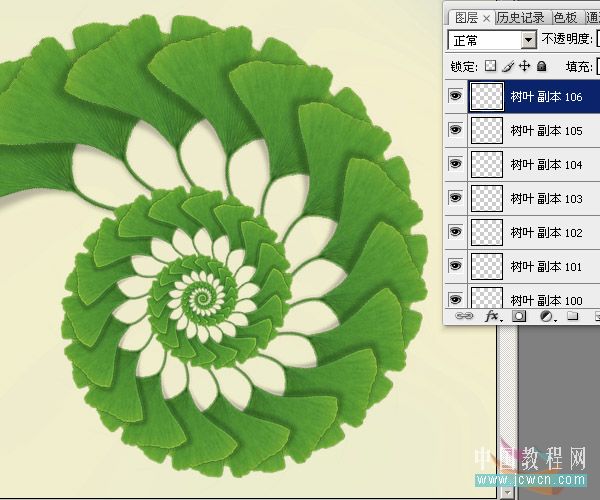 按下shift+ctrl+alt+t,我們可以看到,樹葉圖層被復制了一個副本,并按照我們剛才設置的變換方式進行了縮小旋轉。一直按這個快捷鍵,樹葉可以被一直復制下去,最后形成一個螺旋形的圖案。
