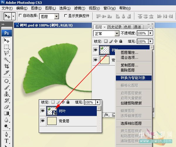 先把樹葉圖層轉化為智能對象。按圖示方法,在樹葉圖層的名字上單擊右鍵,轉換為智能對象。可以看到這個圖層的縮略圖右下角出現了智能對象的圖標。如圖所示: