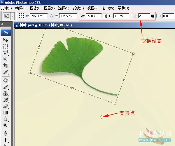 下面開始第一次自由變換。單擊樹葉圖層,按下ctrl+t。對樹葉層進行自由變換。把變換中心點放置在框外,這樣在我們進行復制變換時,樹葉就會圍著這個點一邊旋轉一邊變換啦。在上部屬性欄里如圖示進行設置,將樹葉向右側旋轉一個角度并縮小。