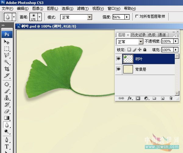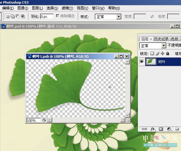 下面我們實際操作一下。下載本教程提供的文檔,可以看到,它由兩個圖層組成,一個是背景層,一個則是在上方的樹葉層。我們為這個樹葉層還加上了一個陰影。這樣在復制變換時,還可以加入陰影效果。如圖所示: