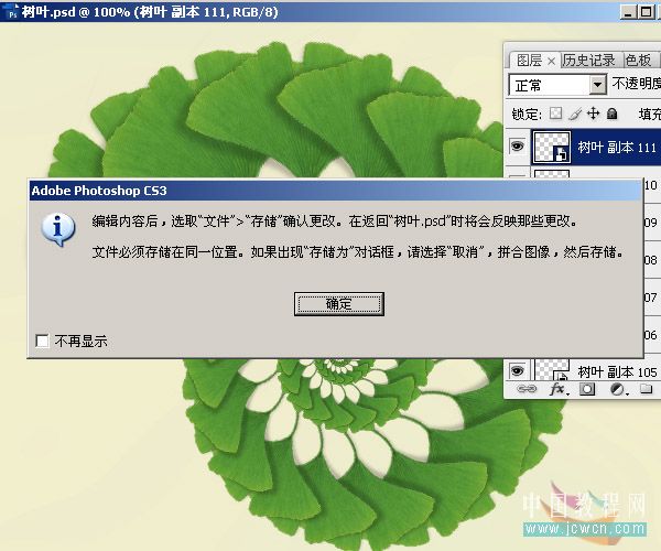 雙擊任何一個智能對象圖層右下角的智能對象圖標,可以看到如圖示的提示框,提示我們可以對智能對象進行統一修改并保存為一個單獨文件。如果我們對這個文件進行了重新編輯,那么所有使用這個智能對象的圖像都會變化以反映這個更改。因此對智能對象的更改要慎重。