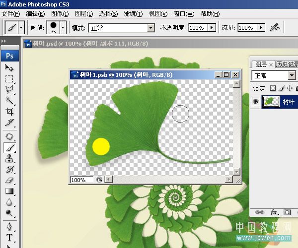 我們用最簡單的方法來測試。使用較硬的畫筆筆頭,在這個樹葉的左邊角上點一個圓點。此時我們看下部使用智能對象的圖像,并沒有任何改變。