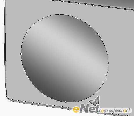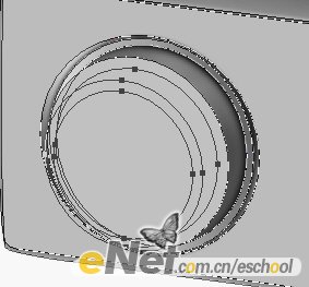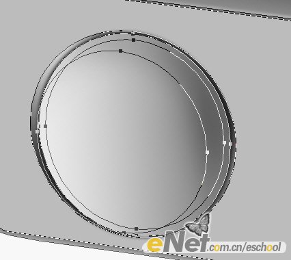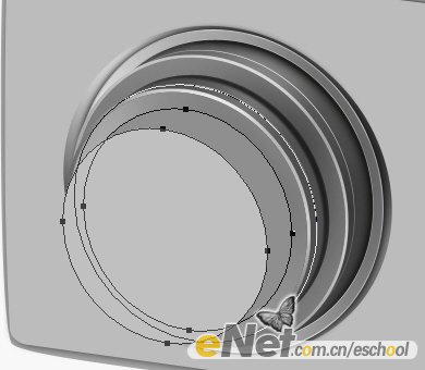 7.使用與前幾歩相類似的方法制作出鏡頭部分,將路徑填充灰色,再用加深減淡工具涂抹出光感,效果如圖所示:
