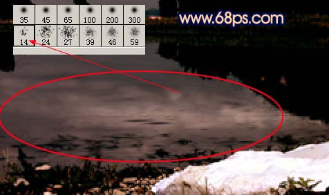 7、新建一個(gè)圖層,按ctrl + alt + shift + e蓋印圖層,選擇涂抹工具,然后再選擇一個(gè)雜點(diǎn)較多的筆刷,在圖片水面及天空部分把有黑點(diǎn)的地方涂一下,大致效果如圖12。