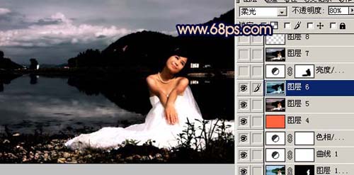 6、新建一個(gè)圖層,填充顏色:#fd633d,然后把圖層混合模式改為“柔光”,圖層不透明度改為:80%,效果如圖10。