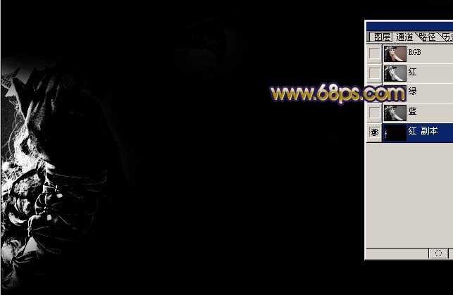 | 8、從現(xiàn)在的效果可以看出人物部分還不夠活躍,需要一些高光元素來點綴一下,最好的辦法是把人物頭發(fā)部分渲染成有反光的效果,下面開始操作:把背景圖層復(fù)制一層,按ctrl + shift + ]移到圖層的最上面,然后點通道面,把紅色通道復(fù)制一層,按ctrl + m適當(dāng)加大頭發(fā)部分的對比度,其它部分用黑色畫筆涂黑,大致效果如圖15,然后按ctrl點圖層調(diào)出選區(qū),回到圖層面板新建一個圖層,填充白色,然后把下面的圖層隱藏,效果如圖16。 |