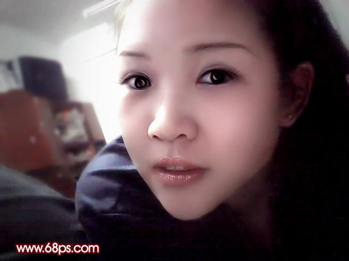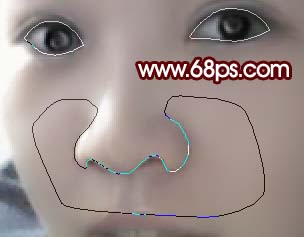 4、新建一個(gè)圖層,蓋印圖層,這一步處理眼睛和鼻子,先用鋼筆工具勾出眼眶及鼻子下半部分,按ctrl + enter轉(zhuǎn)為選區(qū)后用加深工具,曝光度為:5%左右加深邊緣部分,加深的時(shí)候用力要均勻,鼻子部分稍微加深一下即可,鼻孔部分可以加黑一點(diǎn),然后再加深眼珠,再用減淡工具加上高光,然后再修飾細(xì)節(jié)部分,如眼睛雙眼皮,嘴唇,眉毛,臉部輪廓的處理,這些就不詳細(xì)介紹,大致效果如圖6。