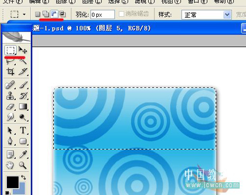 新建一個(gè)圖層,然后把矩形背景選起來,方法和上面一樣,然后選擇矩形選框工具,再把上面的從選區(qū)中減去選上,在原有的矩形選區(qū)上拉一下,得出如下選區(qū)
