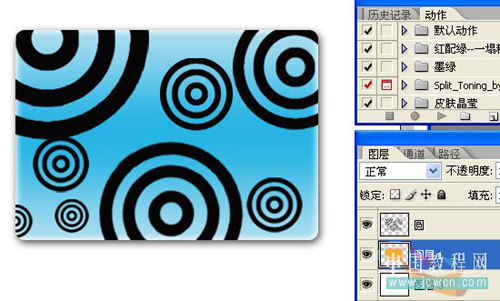 復(fù)制多兩個(gè)圓,然后ctrl+t進(jìn)行自由變換,在縮放的同時(shí),按住shift+alt進(jìn)行等比例縮放~最后效果如圖~完工后,把這三個(gè)圓的圖層合并起來`(把三個(gè)圖層選起來,按ctrl+e就可以合并啦~)