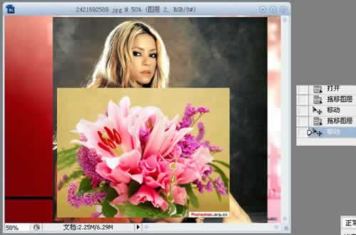 隱藏人物圖眼睛,對花圖調整色階,使其鮮艷些,然后疊加