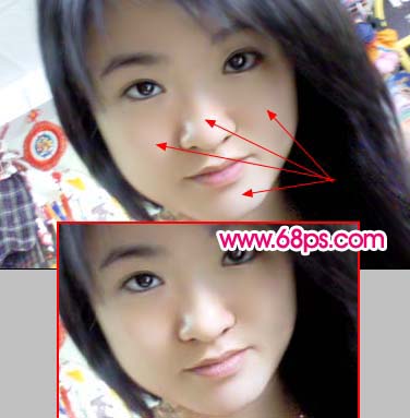6、選擇減淡工具,曝光度為:10%左右,在人物臉上有反光的地方涂抹,適當加大膚色的質感,大致效果如圖7。