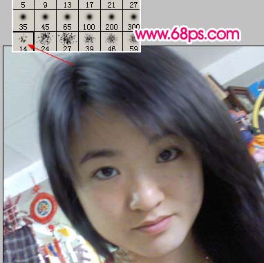 1、打開原圖素材,按ctrl + j把背景圖層復制一層,然后選擇涂抹工具筆刷選擇下圖所示雜點較多的筆刷,壓力為:50%左右,然后順著人物頭發涂抹,去掉頭發上的雜色,效果如圖1。