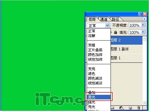 2、其次添加一個(gè)新的圖層,然后填充綠色,將該圖層模式設(shè)置為柔光