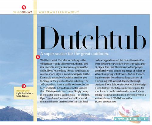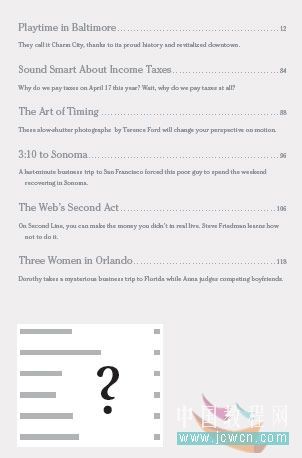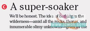 c :小標(biāo)題及正文采用 itc cheltenham 字體,這種字體在很多雜志里會(huì)經(jīng)常見(jiàn)到。一種 20 世紀(jì)早期出現(xiàn)的字體。作為密集的正文文字字體,該字體具有清晰的閱讀性,而且顯得很低調(diào)。