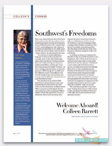 你懷著激動(dòng)的心情正在乘坐西南航空公司 737 客機(jī)飛往大峽谷旅游,但飛機(jī)外厚厚的云層擋住了你想觀看外面風(fēng)景的視線,百般無(wú)聊之際,你順手拿起一本空中雜志閱讀。你看到什么?不象一般我們平時(shí)所看到的期刊雜志,空中雜志的讀者并不是固定的,每一期的雜志也沒(méi)有什么共同的主題。也正是因?yàn)檫@個(gè)原因,空中雜志必須能夠以一種特有的魅力來(lái)吸引你的視線。西南航空的空中雜志《 spirit 》由 pentagram 公司共同設(shè)計(jì),里面有很多簡(jiǎn)短的文章能夠讓你輕松閱讀,該雜志的設(shè)計(jì)能夠迅速給人一種沖擊力,而且非常漂亮。讓我們看看能夠從中學(xué)到什么?