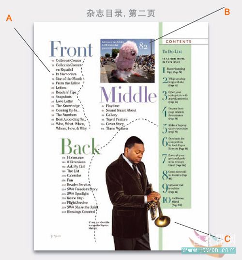c :人物采用爵士歌手 wynton marslis 輪廓照片,其與周圍三小段的目錄形成有機(jī)的配合。每一期的目錄都基本采用這種版面,只是根據(jù)照片的輪廓形狀來(lái)做適當(dāng)?shù)恼{(diào)整。