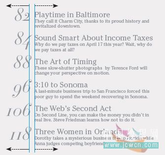 將數(shù)字突出處理,使其成為一個(gè)類似圖片的元素。漂亮的字體( htf didot italic )使其顯得非常養(yǎng)眼。這種處理略顯夸張,也不是所有的地方都適用,如,在《美國(guó)新聞與世界報(bào)道》這些嚴(yán)肅的雜志中使用則有點(diǎn)造作,但對(duì)于《 spirit 》這本只給乘坐飛機(jī)的讀者來(lái)說(shuō)卻非常適合。