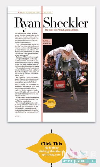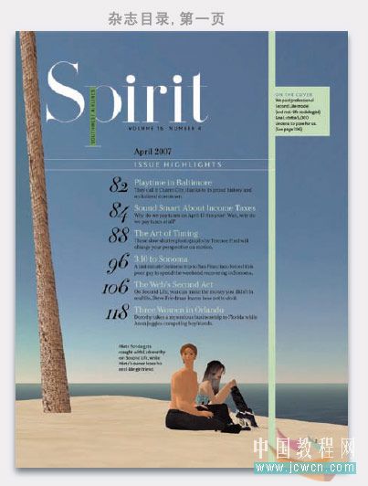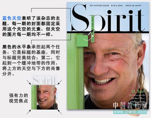 為了設(shè)計(jì)出容易閱讀的版面,《 spirit 》雜志采用三種主要技巧:大標(biāo)題,大圖片,同時(shí)利用垂直的柱狀區(qū)域在每一頁(yè)里重復(fù)。如下圖: