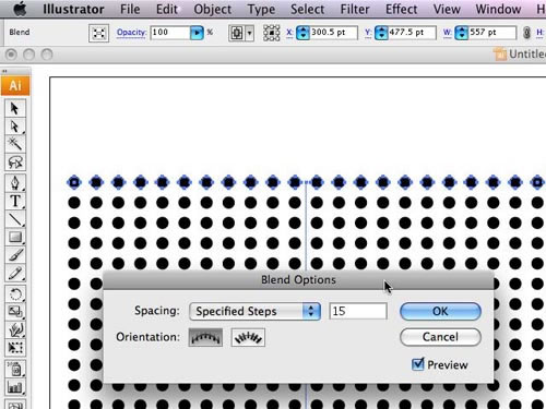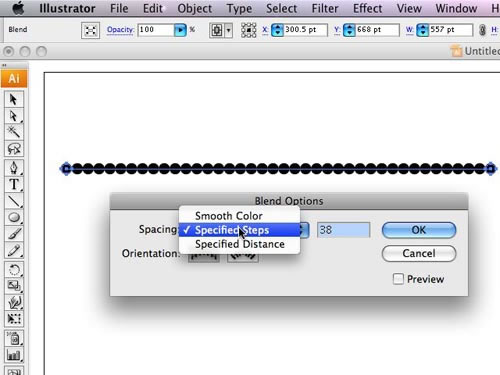 選中它們,打開“對象-混和-創建”,這樣就會在2者之間自動添加一些同樣的圓。然后打開“對象-混和--混合選項”面板,間隔設為指定步數,輸入適合的值,讓圓之間有些空間。(這里圖中是38,讀者可根據實際情況自行調整)