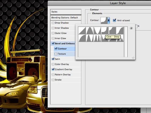 然后再打開這層的混合選項,選擇“光澤”,接下來您需要試驗不同的設置來達到你想要的效果。這里你可以看到有一些深入的變化,我把模式選為疊加,等高線選為雙高峰。具體設置如下圖:
