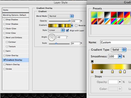 把它放到文件中,打開新層混合選項,選擇漸變疊加,創建一個金色系的漸變,這需要不同程度和色彩的金色組合而成,它們之間要有反差。相關數值如圖: