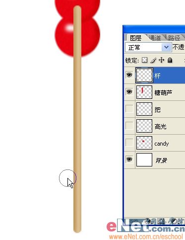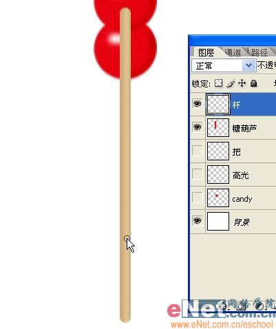 16、將桿圖層拖到糖葫蘆層之下,再次蓋印可見圖層,得到新的帶桿兒的糖葫蘆圖層。