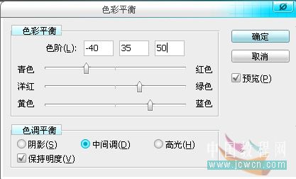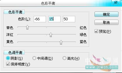 "色彩平衡"參考數值是 "陰影:-66,+15,+50","中間調:-40,+35,+50","高光:-13,+23,+75"