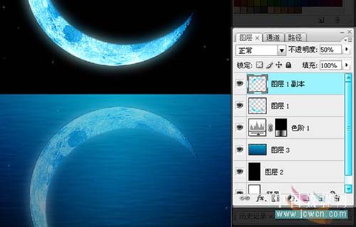 8.把圖層1,月亮那層,ctrl+j,復制一個,"編輯"-"變換"-"垂直翻轉",然后"移動"到下方,調圖層的"不透明度"為50%,作為水上的月亮倒影
