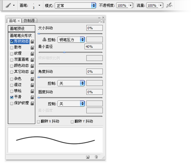,勾選并單擊“形狀動態”選項,設置“最小直徑”為40 %。