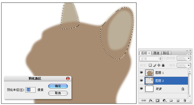 (2)將路徑轉換為選區后,在填充時,可以先將選區羽化一些,這里羽化值可以稍大一些,因為毛發部分所體現的邊緣部分不是很明確的。