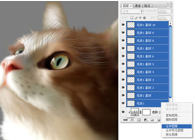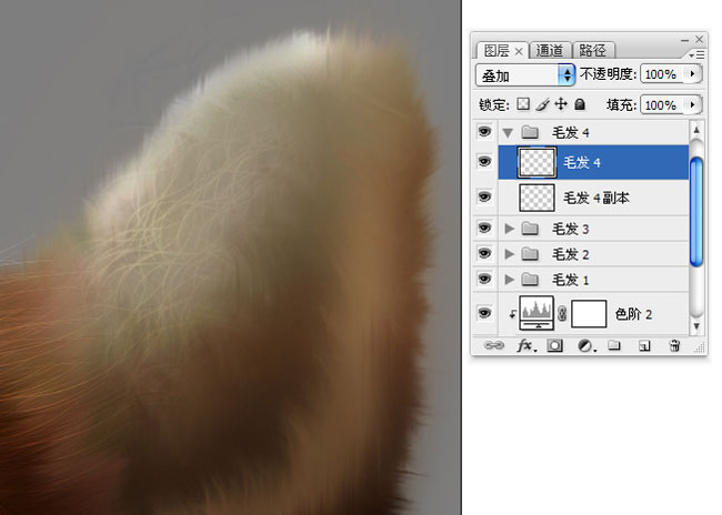 (3)完成后的毛發效果顯得單薄的一些,復制幾個圖層并移動一些位置,形成交錯,直到達到滿意效果,最后將復制的圖層合并。