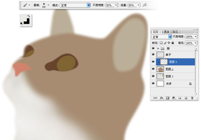 (4)在外形部分之上建立一個圖層,并創建為剪貼蒙版,使用“柔角畫筆”類型的“畫筆工具 ”,適當降低“不透明度”和“流量”,繪制毛發的顏色,在剪貼蒙版上色不用擔心顏色繪制到小貓的輪廓之外,在繪制人物上色時,這個方法也是很實用的。