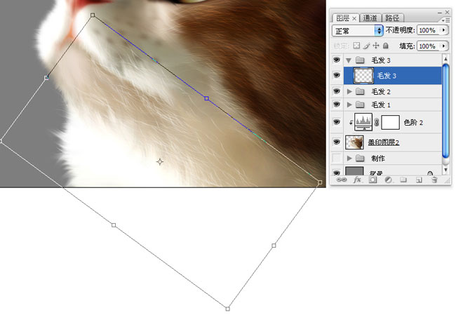 2、額頭和臉部,下巴的細毛,這些毛發為表現的難點與重點,毛發細、密是這些毛發的特點,額頭部分(圖示 2)的走向不是很規則、下巴與臉部(圖示3)毛發的走向比較規則,我將這定為兩種不同的制作方法,額頭部分使用的是描邊路徑的方法,下巴與臉部的毛發使用了定義畫筆,使用自定義畫筆來繪制這些毛發。