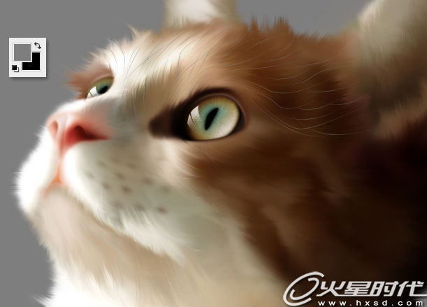 在繪制這幅作品之前我沒有繪制過類似案例,出做時也有些無從下手的感覺,接下來我沒有著急動手,而是仔細的分析了這個案例的關鍵點,以及各部分的特點,和所需的技術方法,做到心中有數,這個案例的成敗關鍵在于小貓的毛發部分,我將小貓的毛發主要分為了幾種類型,分別使用不同的方法來制作,就能產生逼真的效果。