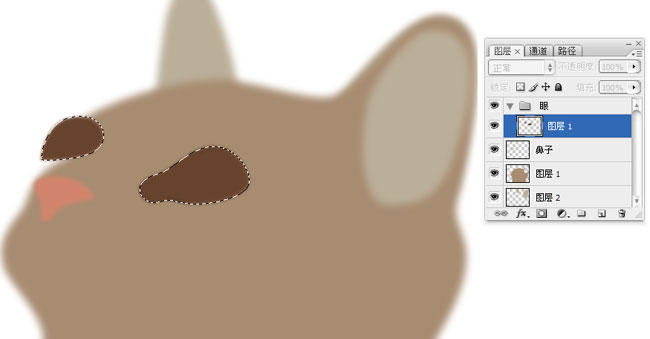 (3)“鼻子”部分的繪制比較簡單,只需占用一個圖層,“眼睛”部分的繪制比較復雜,這里首先新建一個“圖層組”,便于管理后面繪制眼睛所需的圖層,組中新建一個圖層,首先只需確定一下眼睛的大體形狀即可。