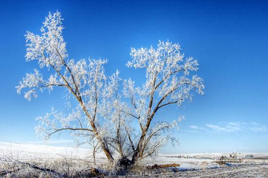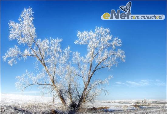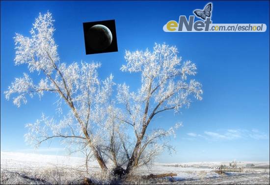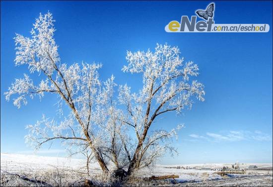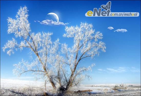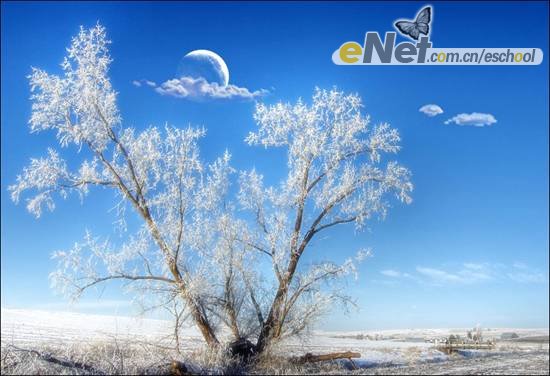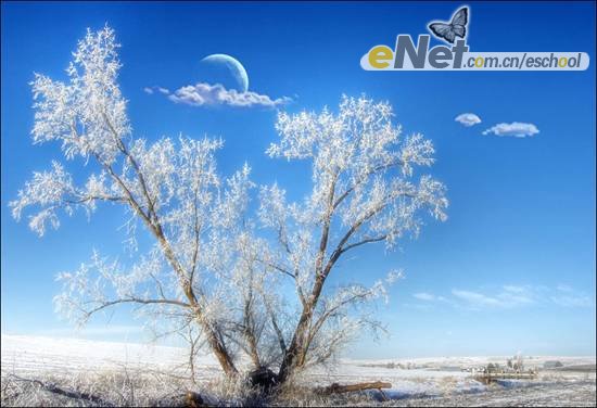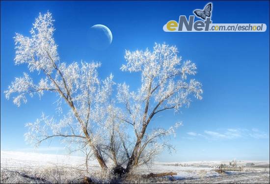 第一步:首先是選擇一張背景照片,這將是我們的“仙境”的主體與基礎(chǔ)。我選擇的是一張冬季的風景照,樹梢上掛著積雪,大地亦是銀裝素裹,唯有天空湛藍如洗,一如倒懸的湖水沒有漣漪。如下圖所示。(我們將該文件命名為【月之仙境】)