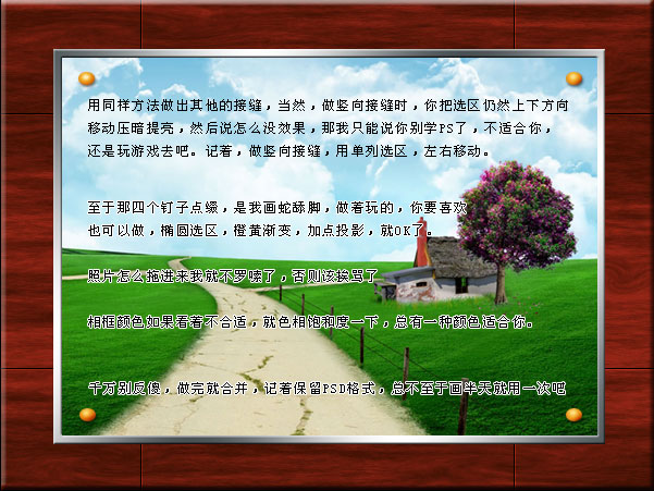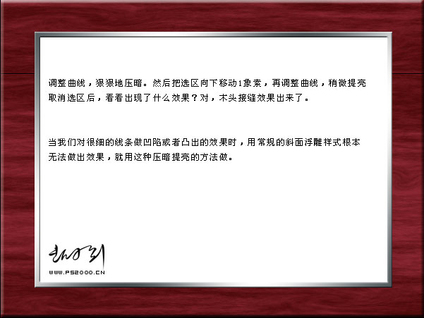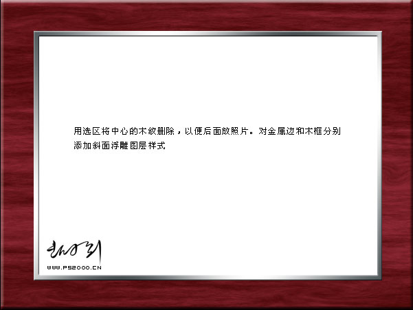 | 5、用選區將中心的木紋刪除,以便放照片。對金屬邊和木框設置圖層樣式,適當加點浮雕效果。 |